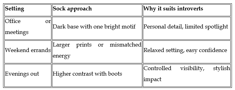 Many people treat socks as a neutral basic. Introverts often appreciate basics too, but not because they lack personality. Basics reduce decision fatigue. They also create space for one detail that feels personal. A single pair of colorful socks can do that without turning an outfit into a conversation starter you didn’t ask for.